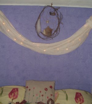 dowels suspended in o-hooks from the ceiling. Each panel has